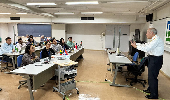 講義は、衛星による地球観測とそのデータの利用に関する講義と、NGOの役割についての講義でした。衛星から大気中の水分、二酸化炭素、メタンなのどの濃度が測定されていることと衛星からの取得情報を国際的な連携で共有する事に研修員は関心を持ったようでした。午後にもICTを利用したスマート農業の講義を受け、その後の遠隔営農実証ハウスなどの見学を行いました。