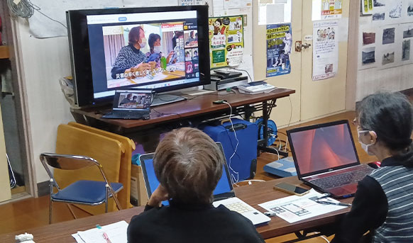 島根県大田市北三瓶まちづくりセンターのスマホ研修会に参加している皆さまは、BHNの国内災害被災者支援活動を伝える動画 JPF【ソーシャルグッド タイムズ】#20 BHNテレコム支援協議会「ICTを活用 シニアを被災地の主役に」 を全員で視聴しました。