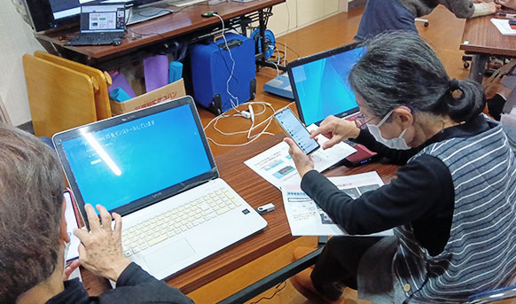 2025年11月19日、広島県呉市天応大浜アパート集会所、呉市天応地区住民5名、坂町住民2名、この日の研修テーマは「スマホの便利機能」、講師はBHN広島事務所の岡崎 幸子氏(主任講師)、杉原 瑞枝氏、沖野 啓子氏、寺岡 和子氏の4名が担当しました。