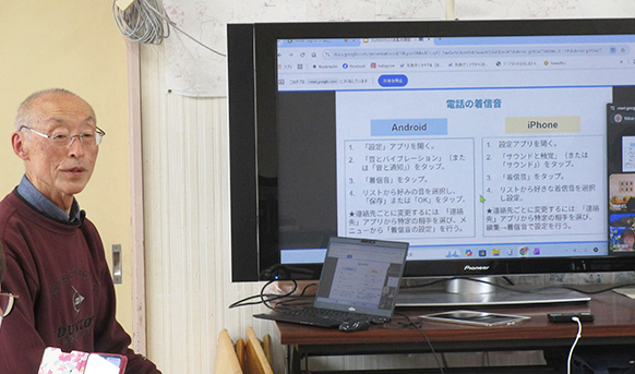 2026年2月19日、広島県呉市安浦老人福祉会館、住民5名、この日の話題は「スマホ基本機能と設定研修」、講師はBHN広島事務所の廣中 香氏が担当しました。北三瓶地区研修会と同じ資料を使用しました