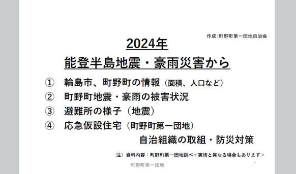 BHN北陸事務所は、2025年7月30日、輪島市町野町第1団地集会所を会場に、「2024年能登半島地震・豪雨災害から」と題して、町野町第1団地自治会長を講師とする被災地説明会を開催しました。主なテーマは、①輪島市、町野町の情報(面積、人口等)、②町野町 地震・豪雨の被害状況、③被災・避難所の様子(地震)、④町野町第1団地の防災対策、等でした。能登半島地震発災直後、殆どの家庭が被災者となり、更にこの地区全体が完全孤立状態になり、避難所確保、水・食料確保...等々に対し、被災者住民自身が自発的に活動を開始・分担して困難を乗り切ってきた様子が語られました。後世に語り継ぐべき、貴重な経験とノウハウが含まれた被災地説明会でした。この日の被災地説明会参加者はNTT北陸電友会、NTT北陸支社の皆さまでした。現地説明会場に訪問できなかった方にはネット会議で参加していただきました。ネット参加者10名を含め約35名が熱心に聴講しました。