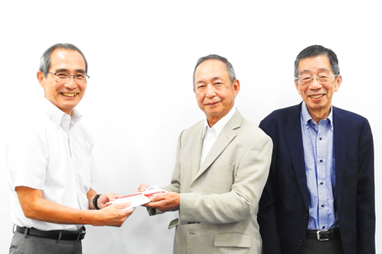 7月27日(水)、同法人より佐藤副会長、平山事務局長(写真右側)が、BHNにご来訪くださり理事長の稲生(写真左)に目録が授与されました。