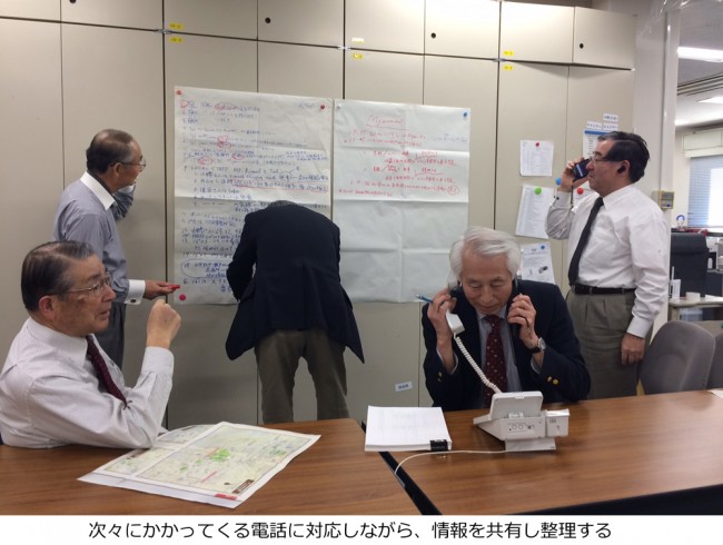 参加したのは理事長をはじめとする役員等7名。事務局は、外務省、JICA、家族、マスコミ役等を演じ、ダッカ事務所、ミャンマーカレン州事務所の現地スタッフにも参加してもらい、実際に国際電話やスカイプを使ったやりとりを行うなど、大掛かりな演習となりました。