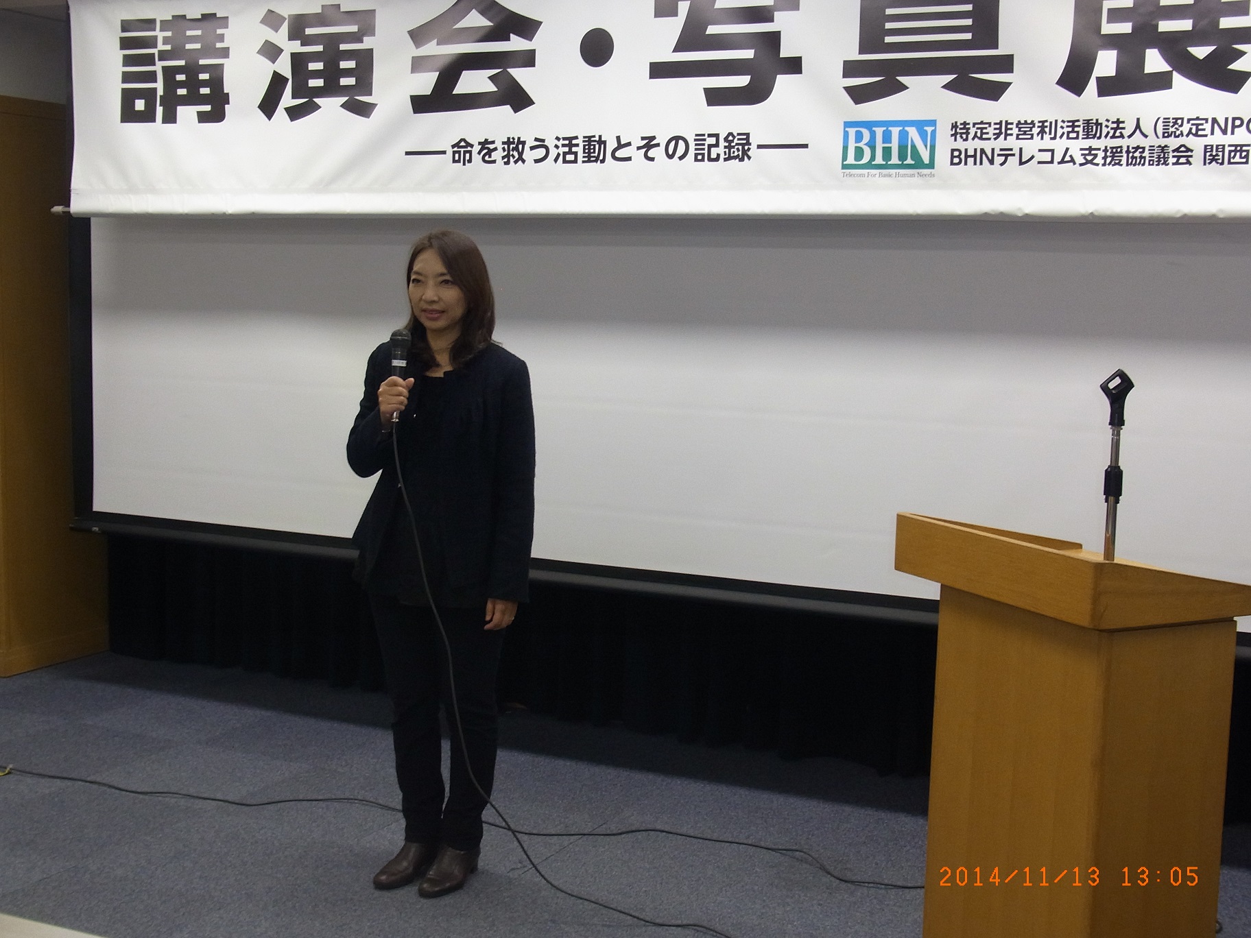 去る11月13日(木)、JR大阪駅のすぐ前、大阪駅前第二ビルにおいて「命を救う活動とその記録」をテーマに当会関西事務所主催の「第6回・講演会と写真展」を、BHN本部から、佐藤征紀会長、秋場美奈子チーフプロジェクトオフィサーの両氏と大阪府政策企画部危機管理室から谷口友英防災企画課長をお招きして開催しました。